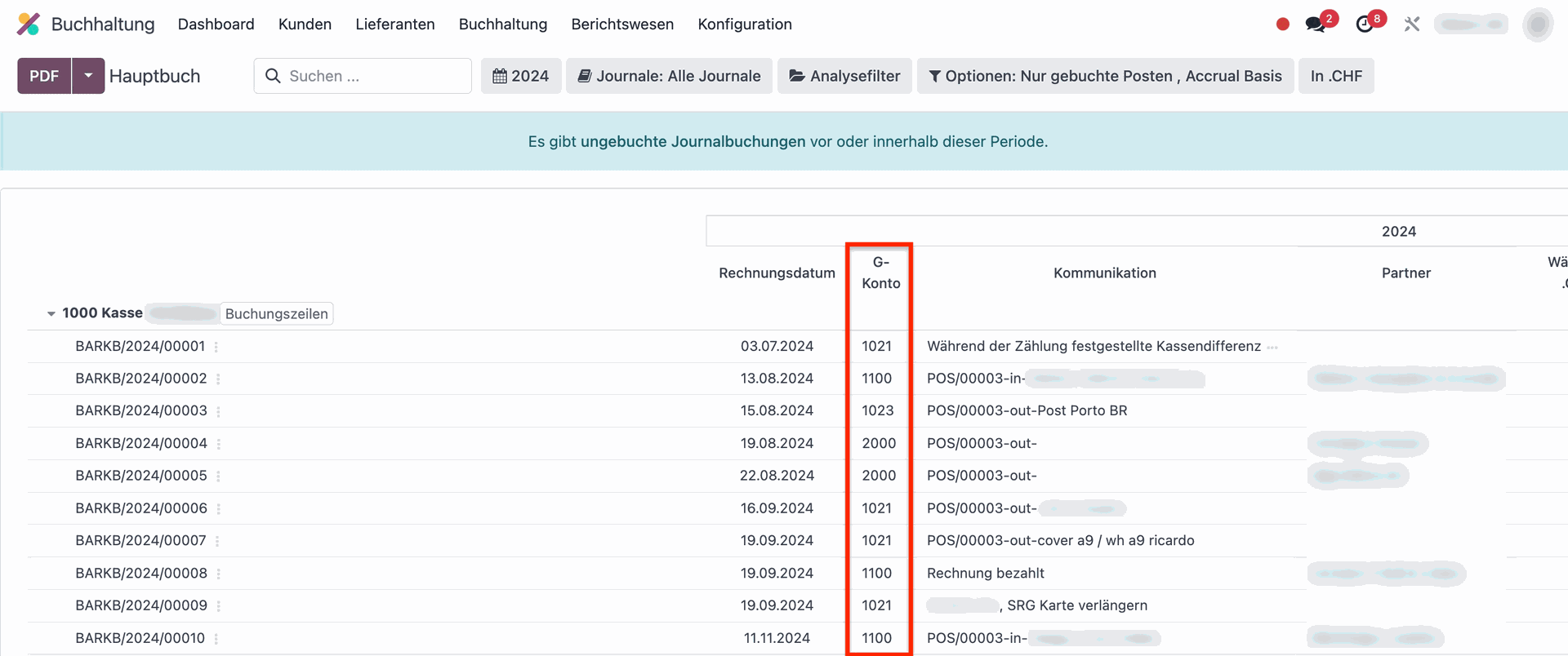 Exportieren Sie Ihr Hauptbuch direkt aus Odoo – inklusive aller relevanten Details zu den Gegenkonten.